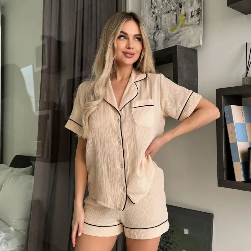 Піжама муслінова жіноча (шорти та сорочка) з кантом, бежевий колір, розмір M